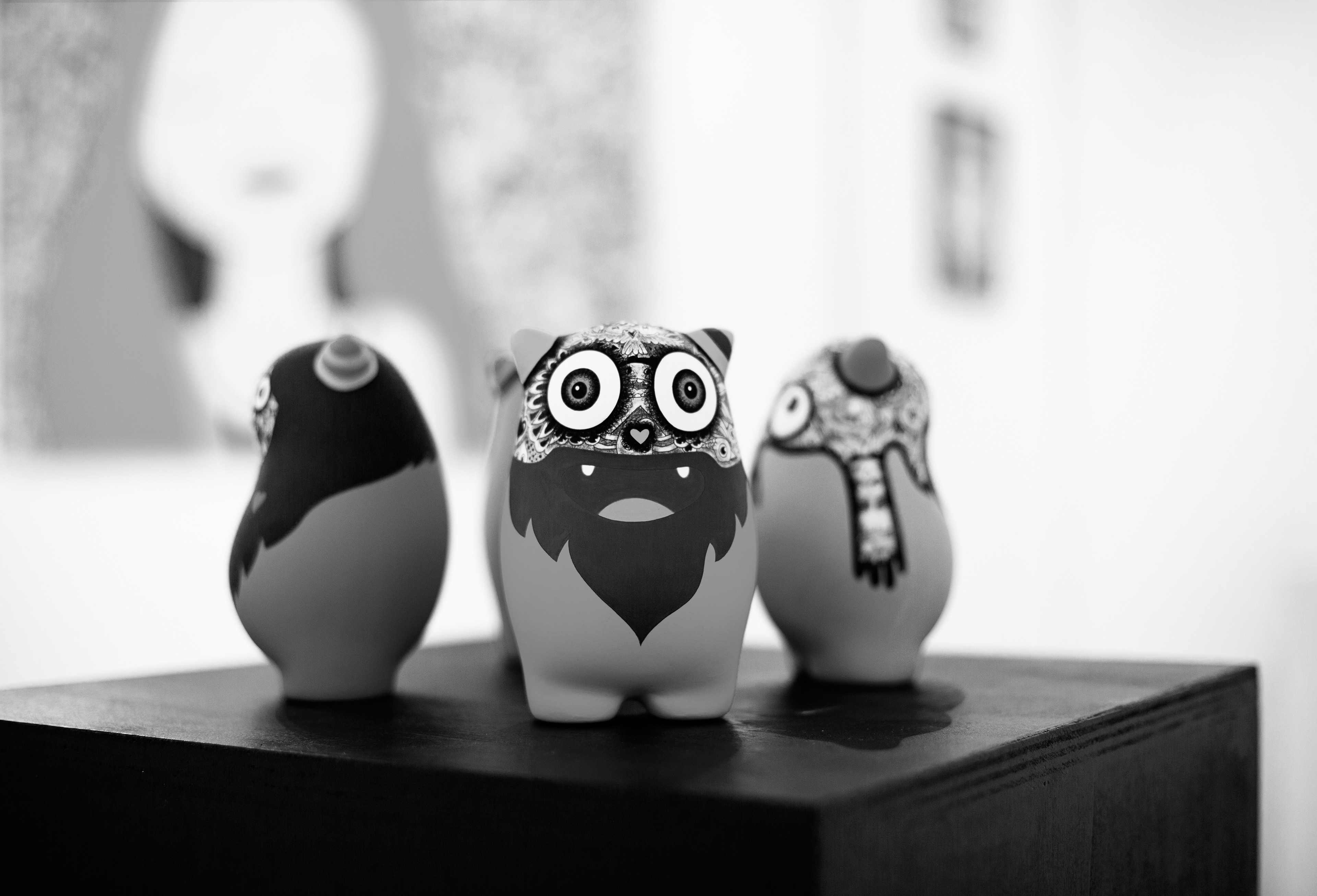 Hackatao’s big bang is shaped “Podmorks”. These little totemic creatures, sculpted in ceramics and decorated with drawings and acrylic, literally are the signed Hackatao book of Genesis. Podmorks are their love’s purveyors, their book of Lancelot; the beginning of experimentation with the alchemy of the two styles; the necessary push for both S and N to completely dedicate themselves to art; the digital element in their physical art, with their 3D models; the gamble on each other.